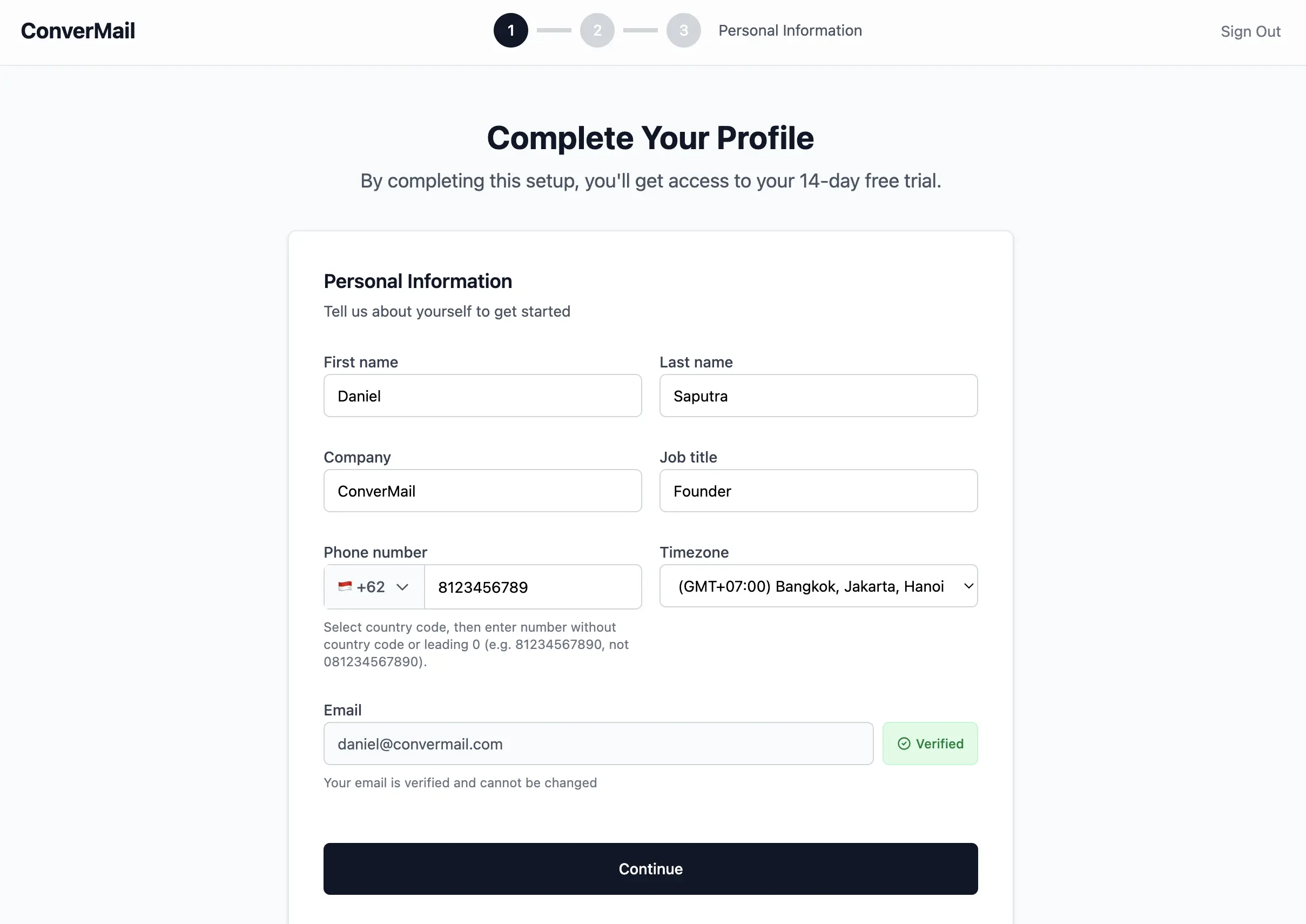 Enter your first name, last name, company name, and job title. These details help us customize your experience and are used in email templates.