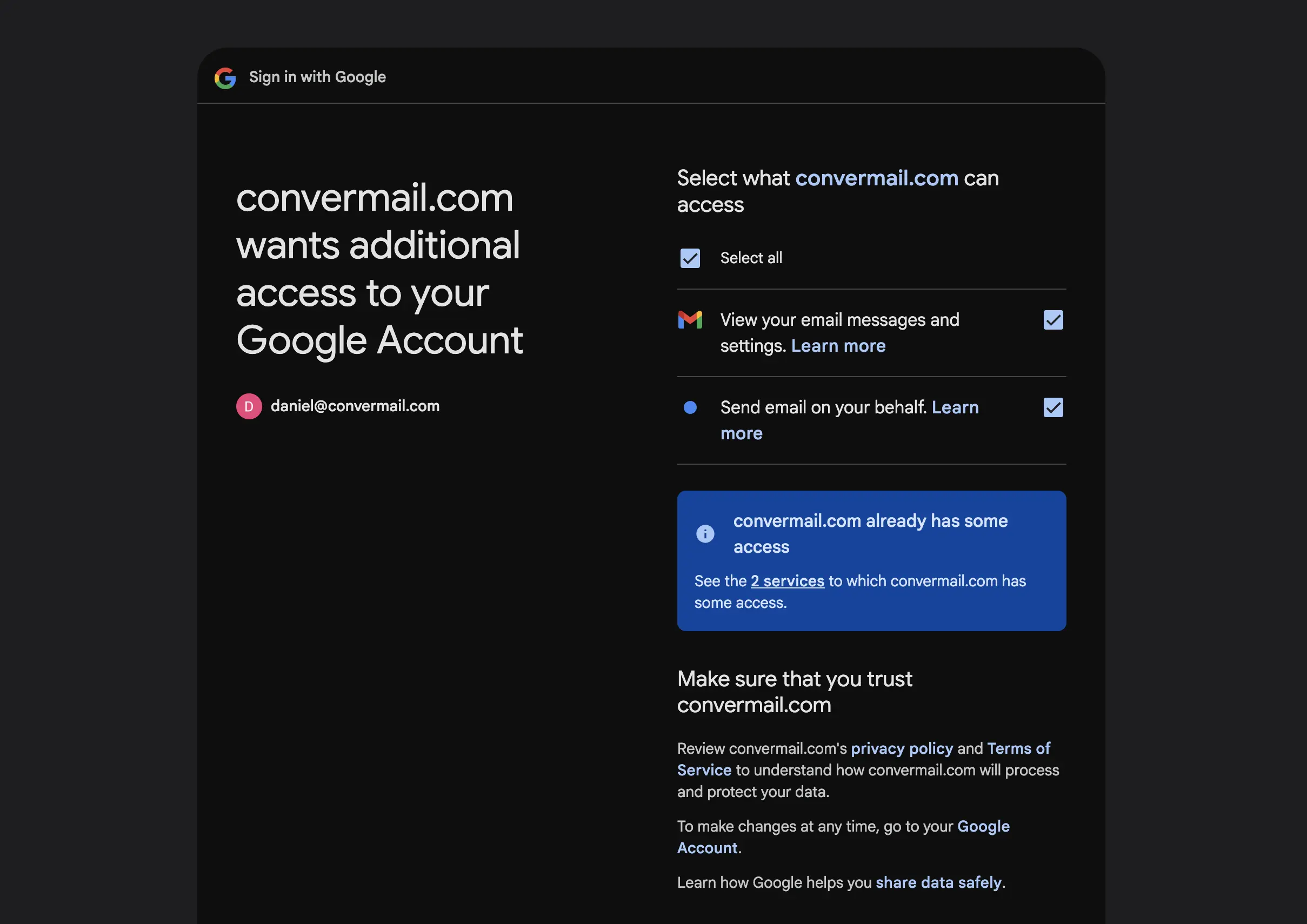 You'll be redirected to Google's secure OAuth consent screen to authorize ConverMail's access to your Gmail account.