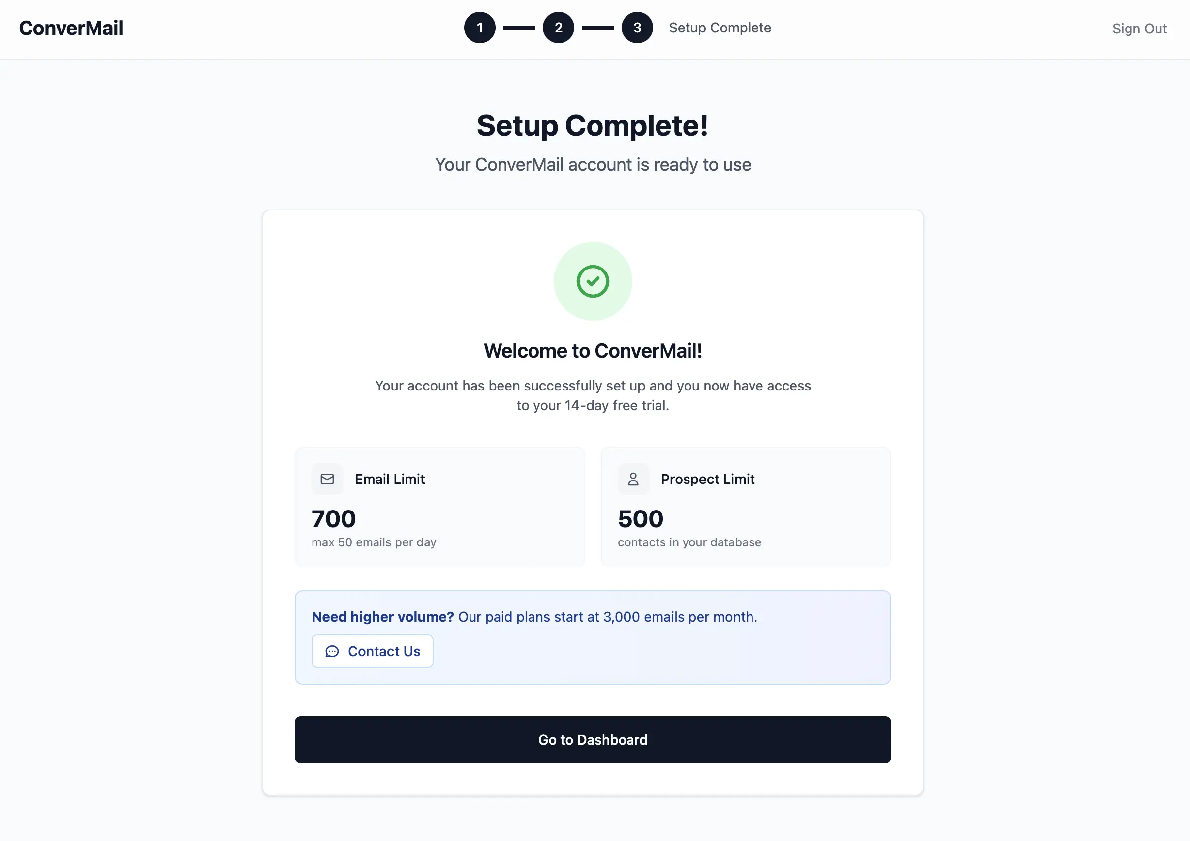 Congratulations! Your ConverMail account is now fully configured and ready to use.