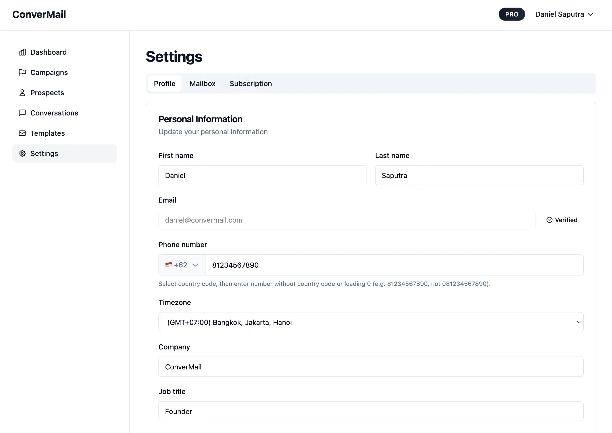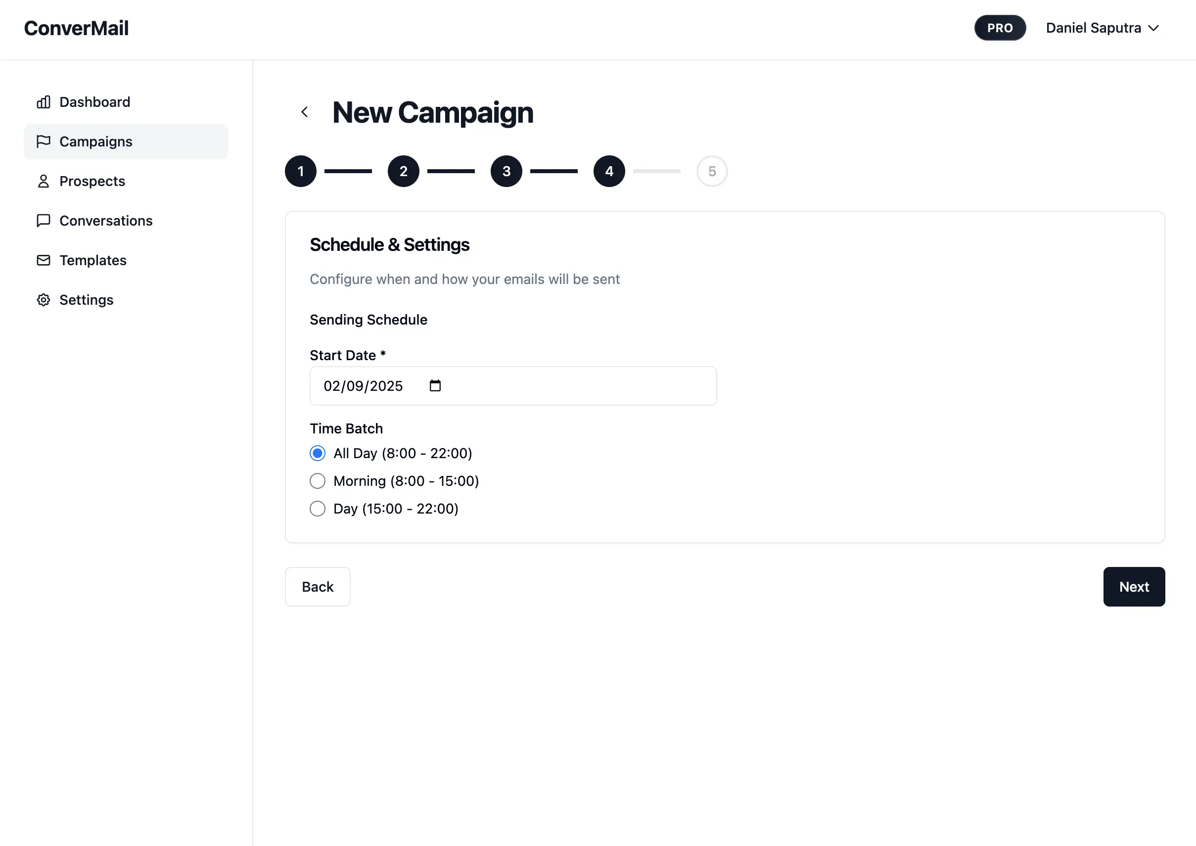 Good timing helps your emails get opened and read. ConverMail lets you choose a start date, daily sending hours, and a timezone that fits your audience.
